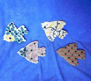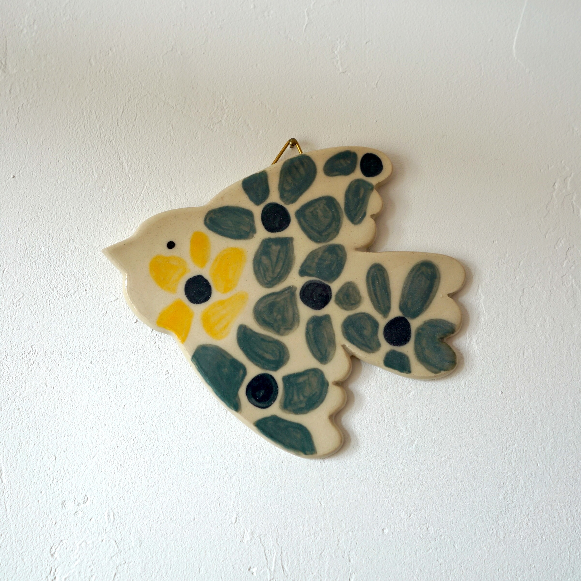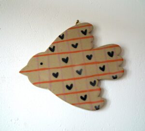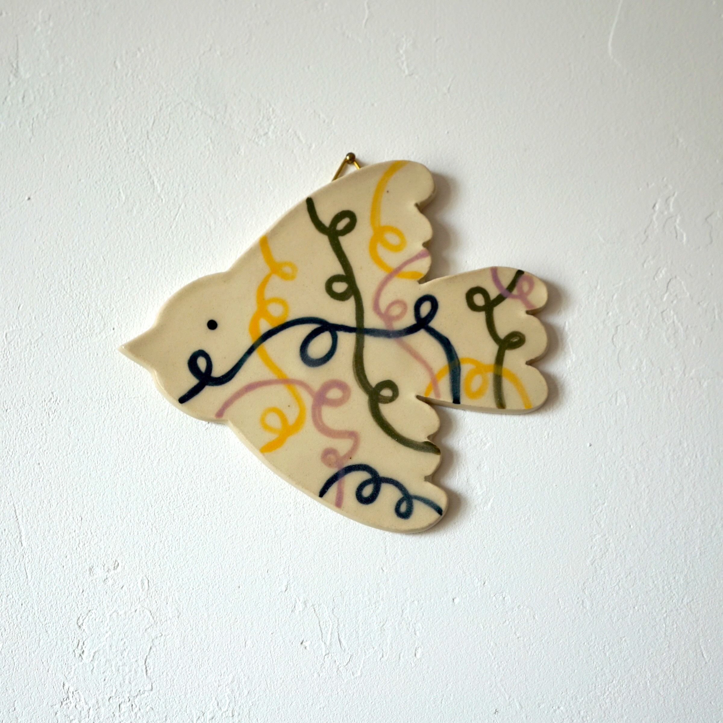 Décoration à suspendre en grès blanc ou grès de Saint-Amand (beige) peint puis émaillé.